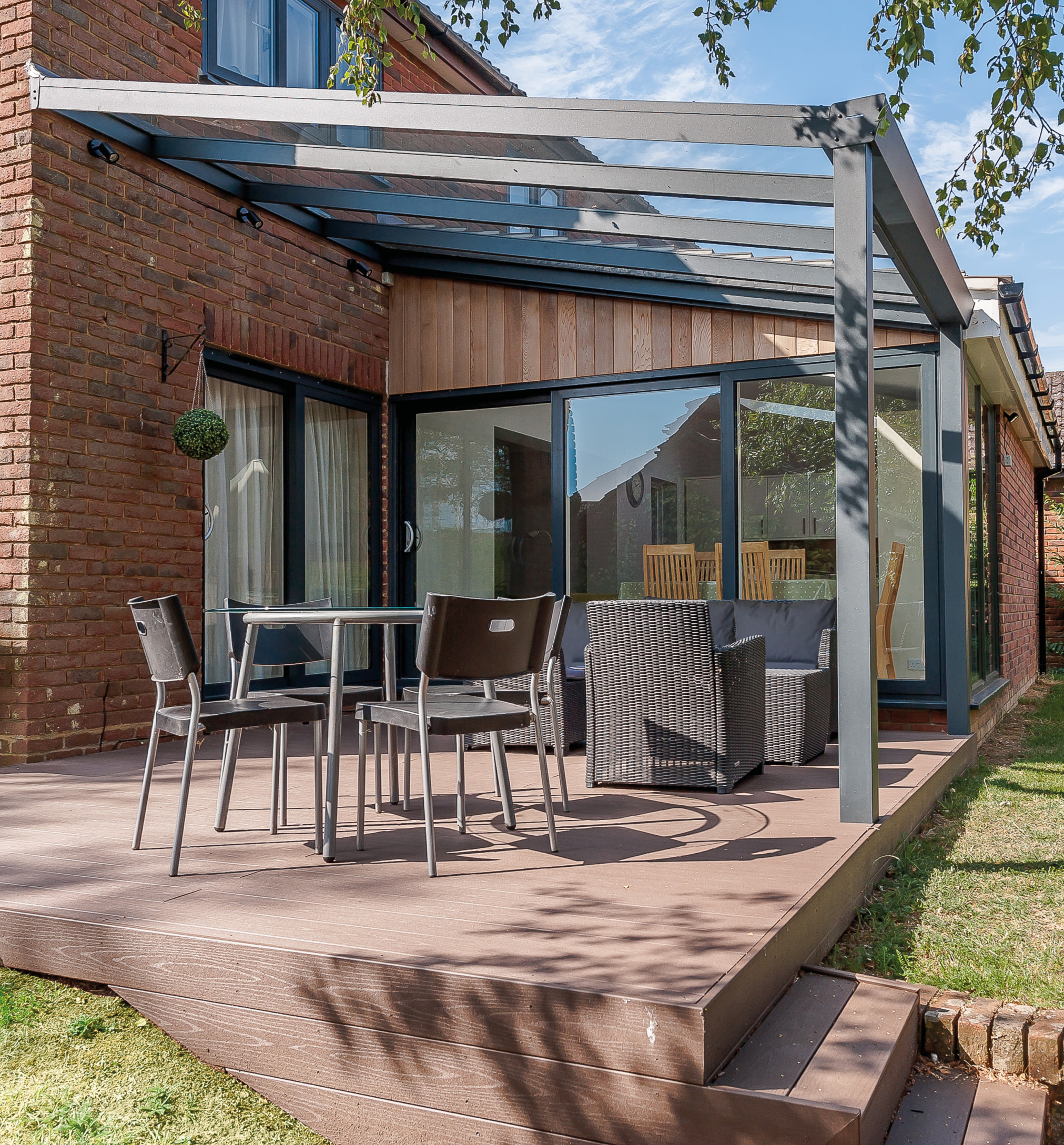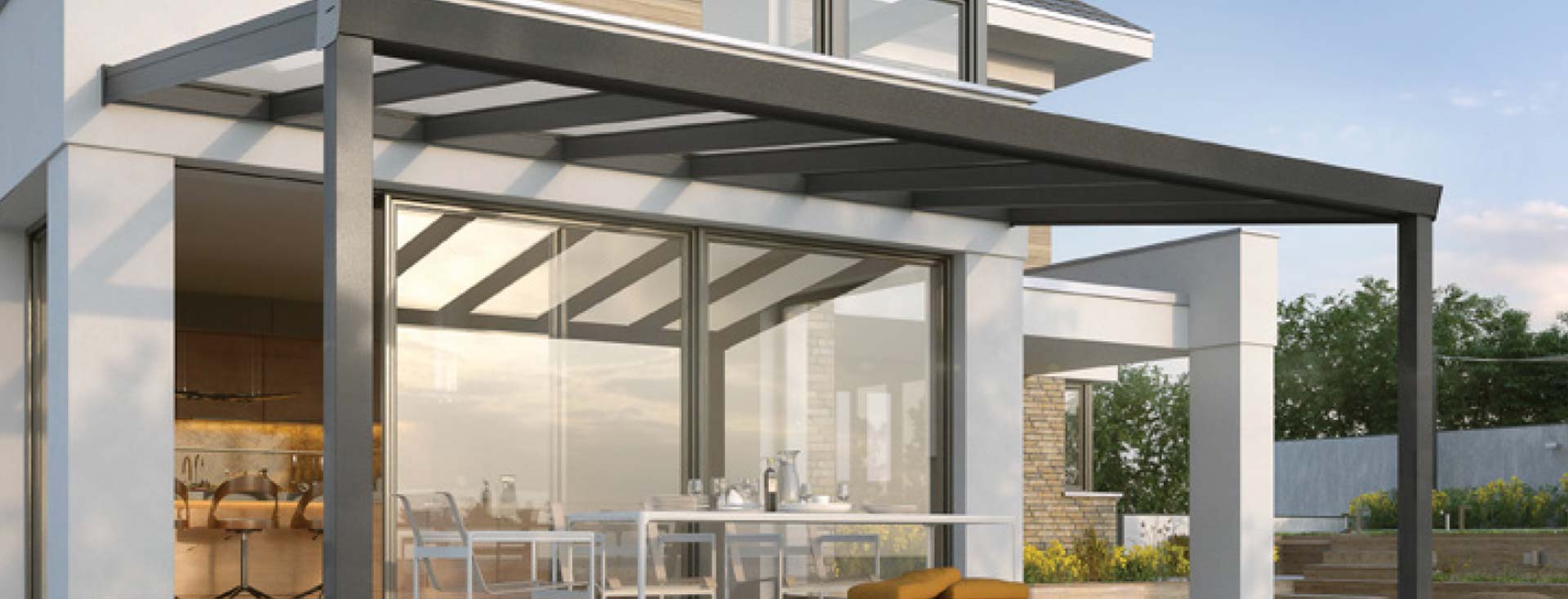 Die Classic-Edition ist eine luxuriöse Überdachung, die mit ihren augereiften, starken und robustem System jeder Wettersituation gewachsen ist. Mit der extrastarken Gigarinne kann man hier im Vergleich zur Classic-Edition oft einen Pfosten einsparen. Das kann von Vorteil sein, wenn man z. B. vorne ein Glasschiebewandsystem montieren möchte.