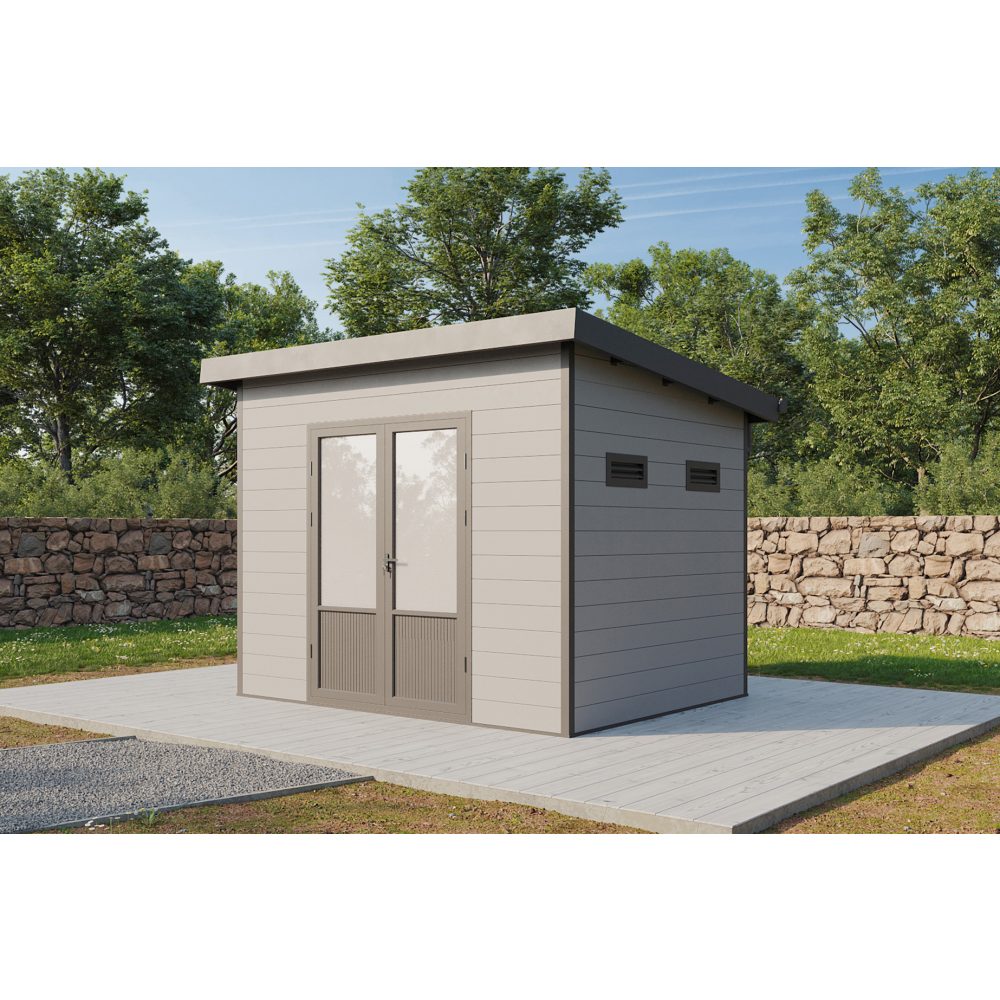 Das pflegeleichte Gerätehaus begeistert mit klaren Linien. Das zeitlose Design passt zu jedem Gartenstil. Dank der außergewöhnlichen Türhöhe von 1,90 Meter passen auch sperrige Gegenstände hinein.